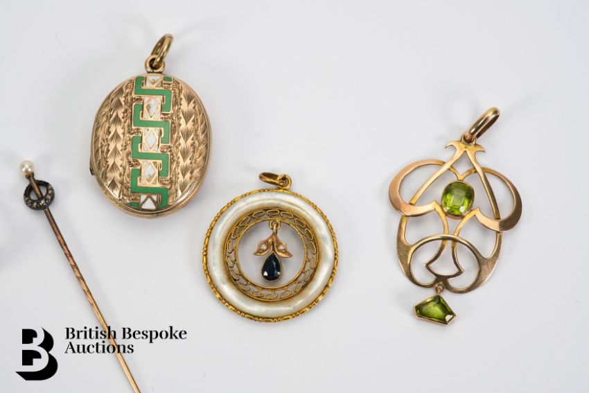 9ct gold Art Nouveau gold and peridot pendant. The pendant including drop measures 45 x 30mm, 2.9 gms. This lot concludes with a 14ct Chinese mother of pearl pendant suspended with a sapphire and seed pearl drop, 27 mm diameter, 3.6 gms and a 14ct gold signet ring, size L, approx 2 gms. This lot concludes with Victorian green enamel portrait locket, approx 28 x 23mm, 8.5 gms and a pearl and diamond tie pin testing as 9ct, with a 3mm pearl and 3 pts of rose cut dias.
