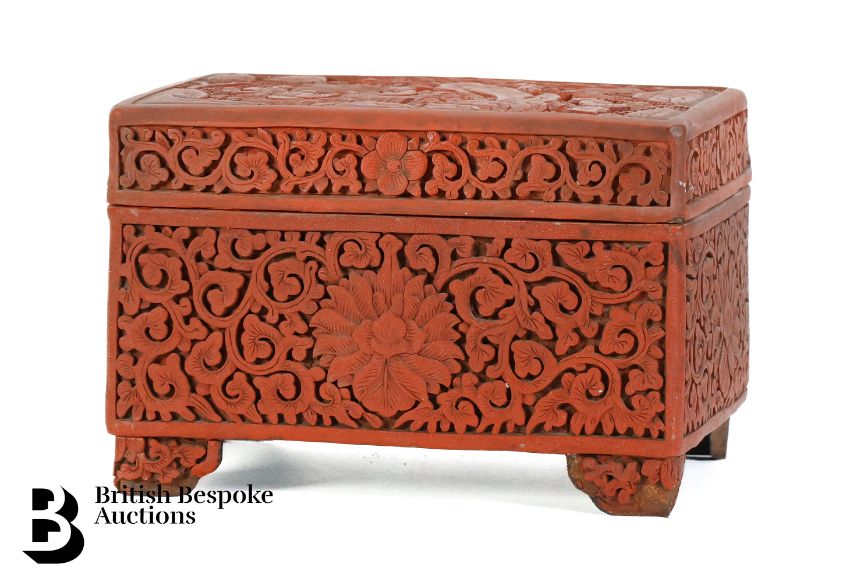 Antique Chinese Cinnabar box and cover. The sides of the box is intricately carved with foliate scroll, the top of the box is carved with figures relaxing in a garden setting, approx 17 x 11 x 11 cms.
