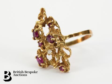 14ct yellow gold bespoke ruby and diamond ring. The ring set with three oval rubies, 4.5 x 3mm, three further rubies 2.5 mm and a single diamond approx 5pts, size Q, 7.9 gms.