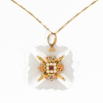 Early 19th century Continental 14ct tri-gold Maltese cross, circa 1830. The cross set with a central ruby approx 2mm framed with six 2mm pearls, the cross formed with four carved pieces of chalcedony, heightened with tri-gold foliate and floral decoration, circa 1830, 40 x 40mm, suspended from a fine 14ct gold chain, 18.1 gms.