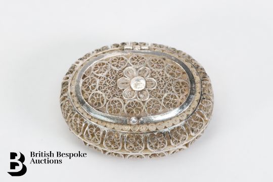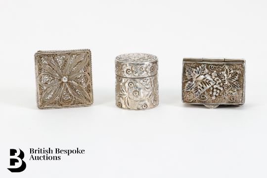 Ten silver pill boxes including an oval silver filigree, square filigree, rectangular filigree stamped 925, silver book form box, stamped 925, squoval box stamped 925, oval pill box stamped 925, oval box with marcasite decoration stamped 925, circular filigree stamped 925 and a small box in the form of a handbag and a small heart-shaped box, 133.1 gms.