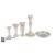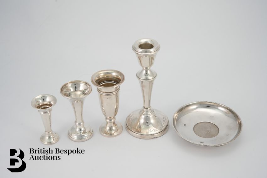 A travelling candlestick, Birmingham assay mark dated 1970 mm W.A (weighted) 145.5 gms; three silver bud vases (two filled) and a pin dish inset with a Churchill Crown London assay mark dated 1966 10 cms diameter. 307.8 gms.
