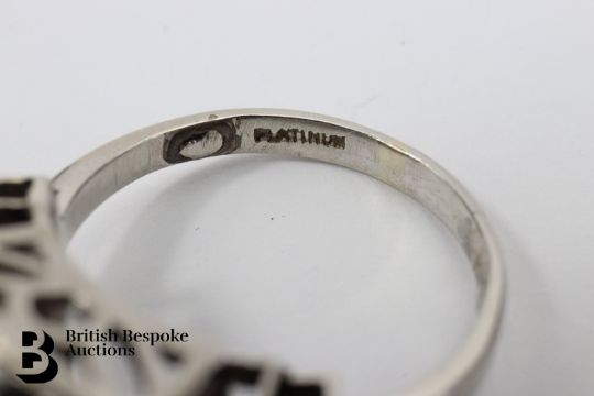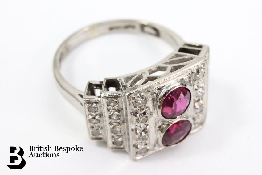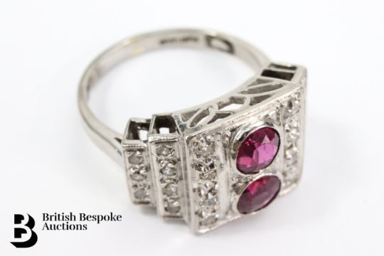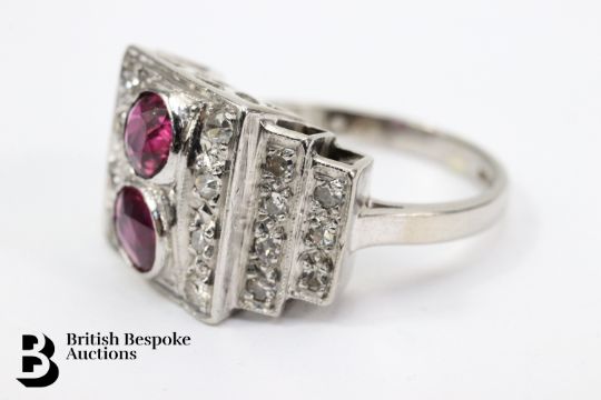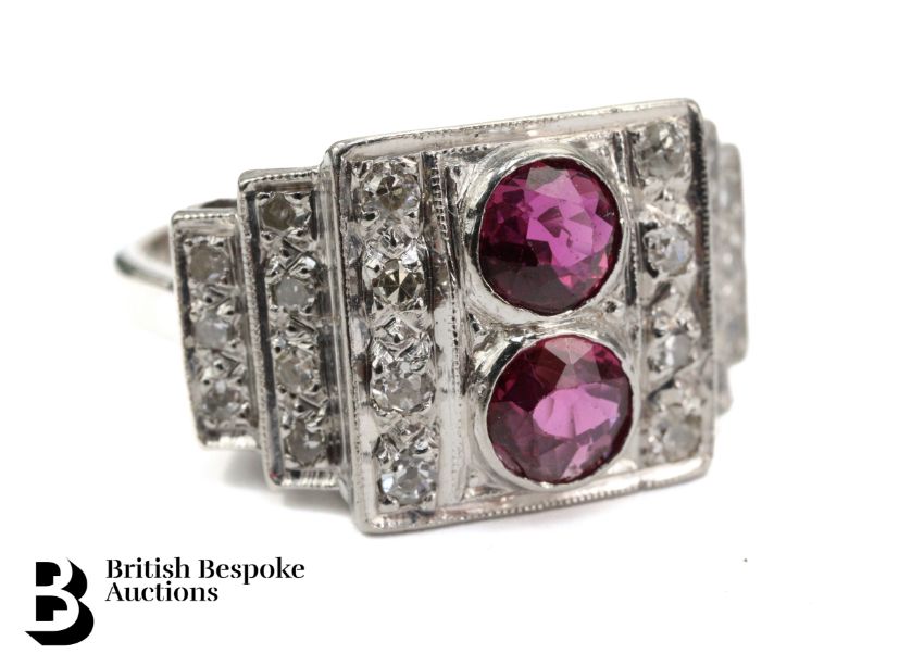An Art Deco platinum and diamond ring, step set with two pigeon-blood rubies and 35 pts of dias, size O, approx 8.3 gms