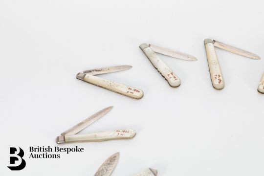 Thirteen Victorian and Edwardian silver and mother of pearl fruit knives, from bottom right to upper left, Sheffield hallmark dated 1896, Sheffield hallmark dated 1912, Sheffield dated 1896, Sheffield hallmark dated 1852, Sheffield dated 1912, Sheffield dated 1919, Sheffield dated 1890, Sheffield 1829, Sheffield dated 1830, Chester dated 1896.
