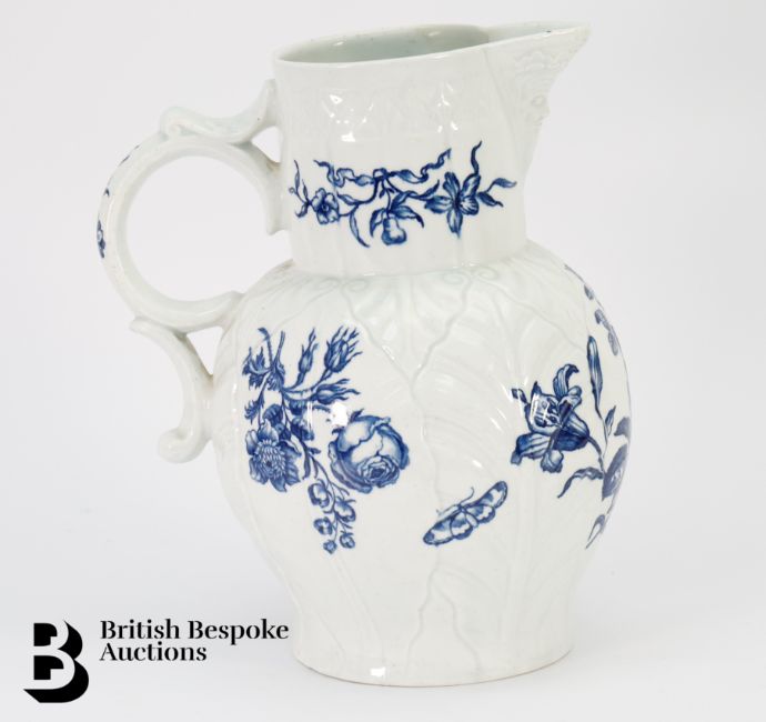 Large First Period Worcester blue and white jug, with a moulded cabbage leaf design, painted with roses, lily and butterfly, circa 1780, blue crescent mark to base, approx 29 cms h.