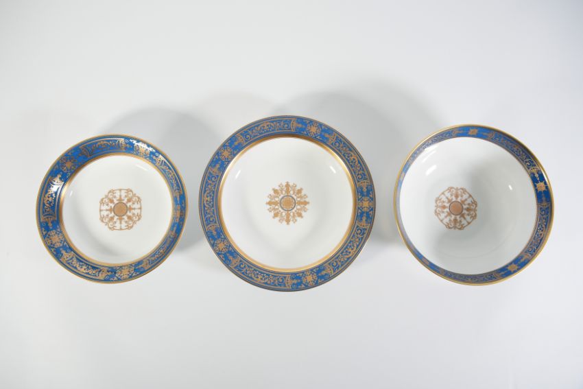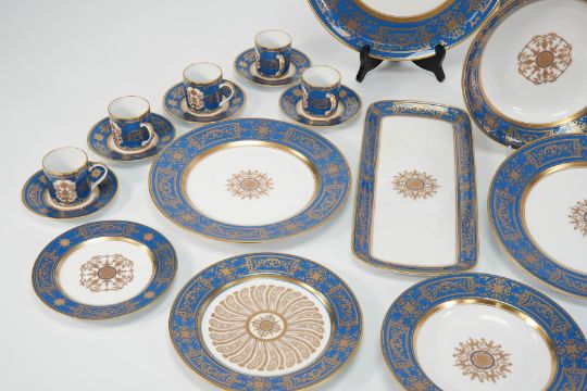 An exquisite Bernardaud 'Aux Rois' fourteen person dining and dessert service, comprising circular charger 32 cms d, oval serving plate 39 x 30 cms, circular bowl 25 cms d, large circular shallow bowl 29 cms d, medium shallow bowl 24 cms d, fifteen dining plates, twenty-nine plates with gilded reserves 21 cms d, fourteen side plates 17 cms d, fourteen soup plates 22 cms d, four oblong serving dishes 24 cms l, fifteen tea cups and saucers, fourteen coffee can and saucers, one sandwich plate.