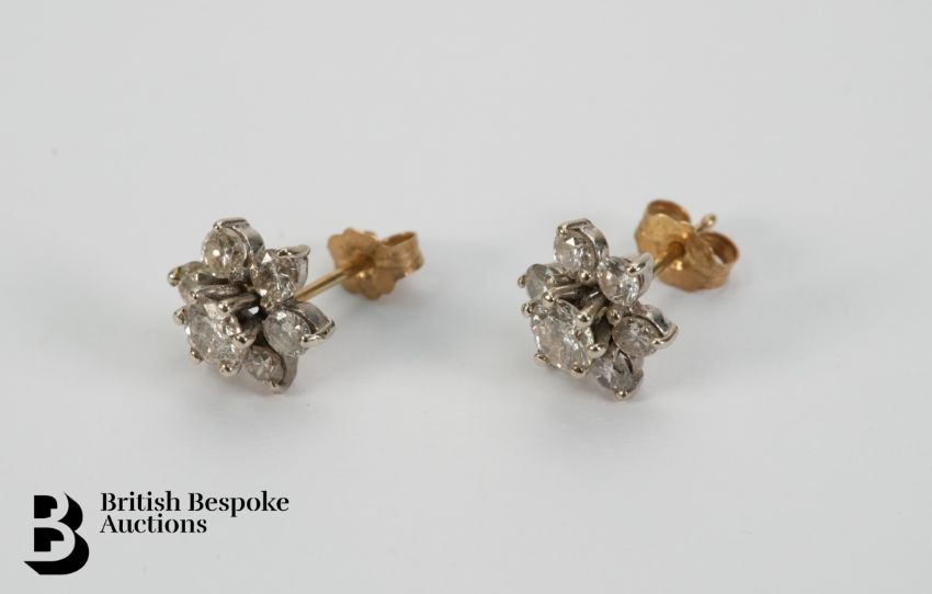 Pair of 14ct diamond cluster earrings, set with approx 25 pts of dias and 14 x 7pt dias, approx 2 gms.