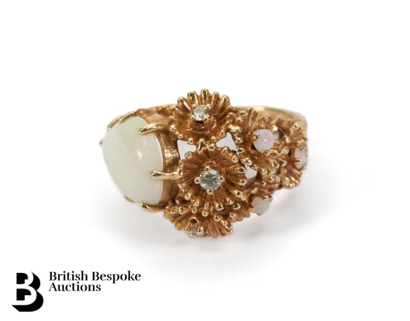 A 14ct bespoke yellow gold opal and diamond ring. The ring set with a tear-shaped opal 10 x 15mm, and three smaller opals of 2.5mm and approx 15 pts of dias in a floral mounts, size L+, 7 gms.