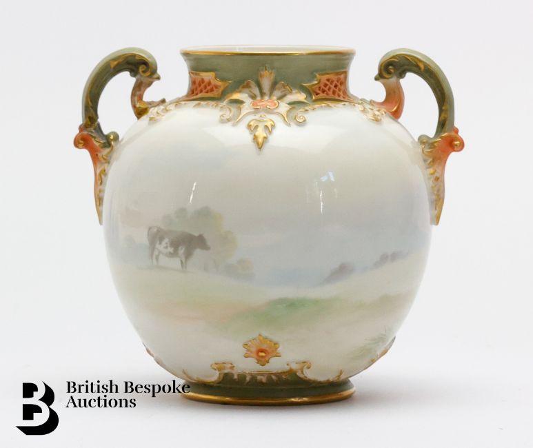 A Royal Worcester porcelain twin handled vase, fine painted with cows and calf beneath a blossom tree, by Edwin Salter, circa 1901, green factory mark 1515, approx 16 cms h. (af)