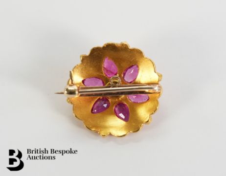An Indian 18ct yellow gold button brooch. The floral brooch set with six tear-shaped rubies 5 x 4mm each and an old-cut diamond, the brooch measures 22mm, 6.3 gms.