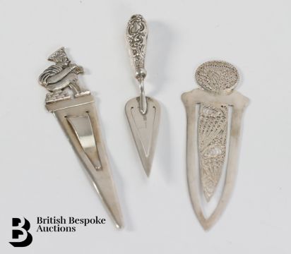 Fifteen sterling silver novelty book marks, of various styles and various hallmarks, mostly English or stamped 925 and a mother of pearl silver capped book mark, total weight 145 gms.