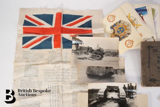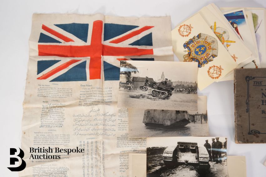 Collection of German and British war photographs and ephemera, including a small quantity of black and white photographs of various WWI era British armoured tanks and the Killen-Strait tractor during experiments at Wormwood Scrubbs, circa 1915; a striking pre and post-damage reconnaissance image of the Möhne Dam destroyed by the Dambuster bomb during Operation Chastise. The dam wall sustained significant damage, approx 75 meters across and 22 meters deep, which led to extensive flooding to the valley below, approx 22 x 18 cms and 21 x 13 cms respectively. A collection of both English and German collectors cards including Interregnum a series of sixty Napoleonic Wars prints by Prescott-Pickupp; a quantity of German Deutschland Erwacht Cigaretten-Bilderdienst (cigarette cards) including nr 33, 31 and 29 of the larger cards approx 12.5 x 17.5 cms and three smaller collectors cards nr 32, 30 and 28, all documenting the rise of the Third Reich; a quantity of Regimental Standards and Cap Badges by John Player, WWII era Allied/RAF Far East silk issue Goolie Chit, showing the Union Jack and a message in various foreign languages including Chinese, Bengali, Burmese, Tamil, French, Sumatra. A WWI era The Navies at War, a complete Naval Handbook and Register for Gains and Losses together with a copy of Fragments from France by Captain Bruce Bairnsfather.