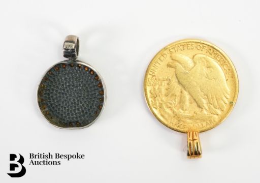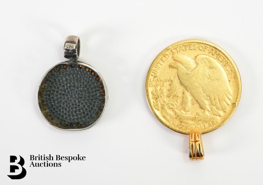 Middle Eastern silver and 18ct gold pendant, 22mm, approx 7.2 gms together with a gold plated 1942 half dollar coin pendant, approx 30mm.