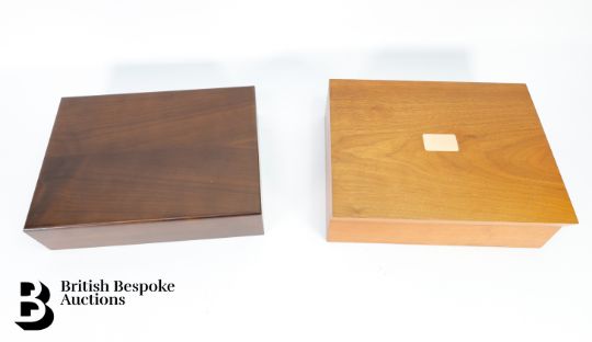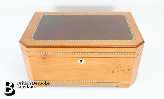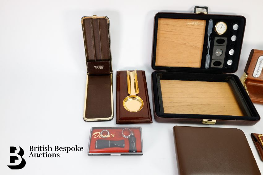 C-gars Cambria Humidor for 100 cigars, glossy Walnut Burl Wood box with Sapelle inlay, one glass hydrometer, Spanish cedar tray with divider, two further dividers at the bottom of the box, together with four leather travelling cigar holders of various sizes together with small oak humidor approx 28 x 21 x 8.5 cms; a wooden desk top humidor approx 18 x 8.5 cms. This lot concludes with a boxed cigar holder and pierce, a small leather cased cigar cutter, Colibri combined lighter and cigar cutter and a desk top cigar holder.