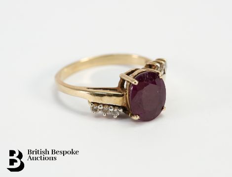 9ct Yellow gold diamond and ruby ring, set with an oval ruby measuring approx. 9 x 7mm, with 12pts of diamonds to shoulders, size N, approx 2.6 gms.