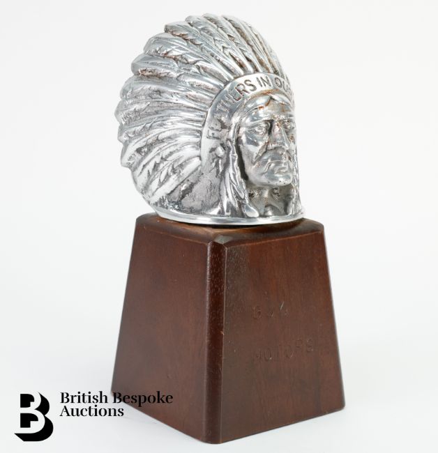A polished aluminium Guy Motors Native American head mascot, as fitted to Guy commercial vehicles from 1930's and 50's era, the mascot reads 'Feathers in our Cap' to the headdress, mounted to a Guy Motors display base, approx 21 cms h.