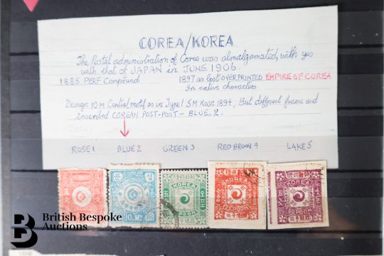 A maroon WHSmith stockbook including stamps of Ireland, Saudi Arabia, British Antarctic Territory, South Georgia, near the middle of the stockbook is Spain circa 1860 to modern day, including 1854 office black impression imperf (five colours), Madrid Exhibition Cinderella's October 1907. A page over has Chinese stamps including Landscapes of Huangshan Mountains (16). The album continues with early Korea Empire stamps Rose, Blue 2, Green 3, Rd Brown 4, Lake 5 and one or two mint stamps. Roman States include Sardinia, Tuscany, Parma and Modena and Franco Rollo stamps, all of good colour.  The second album features a variety of countries represented including Kenya, Uganda and Tanganyika (partially filled). The third album includes various countries including Ascension Island, a few 1949 UPU sets or part sets and some Chile. (3)