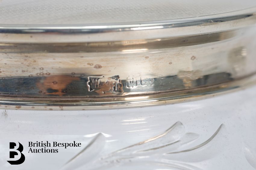 Silver collared glass scent bottle, silver topped cotton wool jar, silver christening mug, Birmingham dated 1962 mm A.S.P Co, 120.8 gms, silver topped cotton wool jar (marks rubbed), silver topped sugar sifter, Sheffield dated 1930 mm James Deakin & Sons.