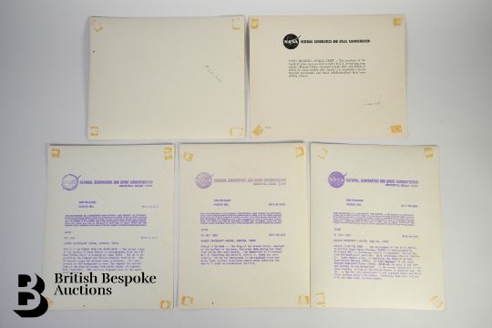 A NASA issue printed photograph of the Apollo 11 prime crew, with printed signatures of the crew Neil Armstrong, Buzz Aldrin (Edwin E. Aldrin Jnr) and Michael Collins, in their flight suits prior to the mission, with the moon in the immediate background, approx 25.5 x 20 cms. This lot continues with: Four NASA issue photographs including a red nr AS10-34-5512  Apollo 10 Lunar Module viewed from CSM above the Moon photographed from the Command and Service Modules from below. The red/blue diagonal line is the space craft window, with Kodak watermark to verso, along with NASA press release in purple print dated May 1969.  A black nr AS11-40-5949 photograph of Apollo 11 on the Moon photographed by Neil A. Armstrong, Commander, during the crew extravehicular activity, with Kodak watermark to verso, along with NASA press release in purple print dated July 1969. A red nr AS11-37-5545 photograph of Apollo 11 on the Moon, the flag of the United States, deployed on the surface of the moon dominates this photograph taken from inside the Lunar Module, footprints on the surface of the moon stand out clearly, with Kodak watermark to verso, along with NASA press release in purple print dated July 1969.  And another photograph of Mercury Atlas at launch, un-numbered, with Kodak watermark to verso. This lot of photographs were gifted by Robert Gilruth (1913-2000) NASA director of the Manned Spaceflight Programme to the couples house cleaner who worked on the following known dates 25/4/1980 and the 4/5/1980 as stated in a letter to a friend (see photo). Note: Robert Rowe Gilruth (1913-2000) was an American aerospace engineer and an aviation/space pioneer who was the first director of NASA's Manned Spacecraft Center, later renamed the Lyndon B. Johnson Space Center.  For more information: https://www.airspacemag.com/history-of-flight/quiet-force-behind-apollo-180957788/#TZyEFYFOwdDCT1PU.99