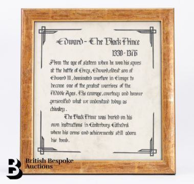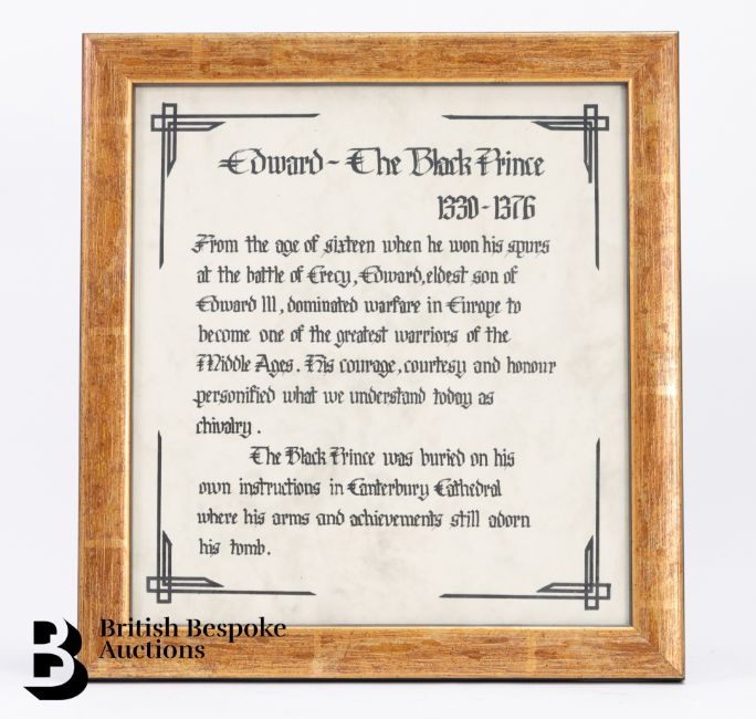 Gill Parker b.1957, bronze figure of Edward, The Black Prince, limited edition nr 9/9, signed to the base. The horse depicted in embroidered caparison. The prince is depicted in full armour carrying a lance. An energetic composition, raised on a polished stone plinth base, approx 62 h x 46 d cms, complete with certificate. Please note this bronze is very heavy.