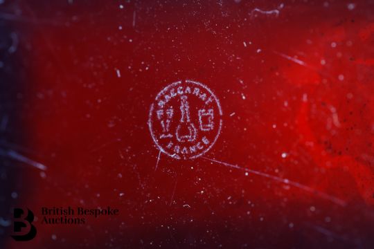 A French Baccarat, Eye 200 claret-coloured tapered vase, approx 20 cms h etched Baccarat.