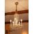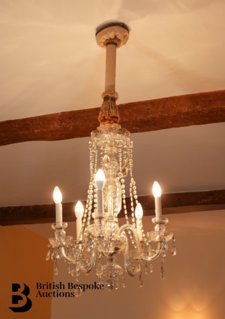 A cut-glass chandelier, five light-scrolling arms festooned with chain drops, approx 30in h x 20in diameter.