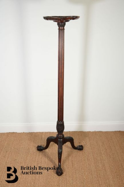 A mahogany torchere, in the George II style, reeded hexagonal stem on a tripod with claw and ball feet, approx 48 cms h.  Provenance: formerly Glympton Park Oxfordshire.