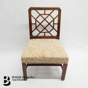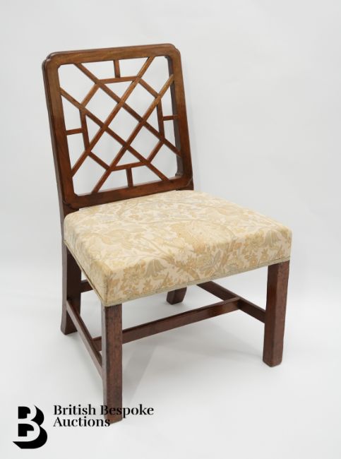 Together with a set of eleven George III mahogany dining chairs, circa 1760, including a pair of armchairs, in the Chinese Chippendale style, the rectangular backs filled with trellis, above padded seats on square supports joined by stretchers, the armchairs of slightly different form.