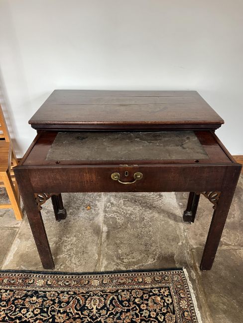 George II walnut architect's/drawing table, circa 1740. The rectangular adjustable top, with wooden supports above a pullout drawer on moulded square supports with spandrels, approx 107 x 61 x 84 h cms.