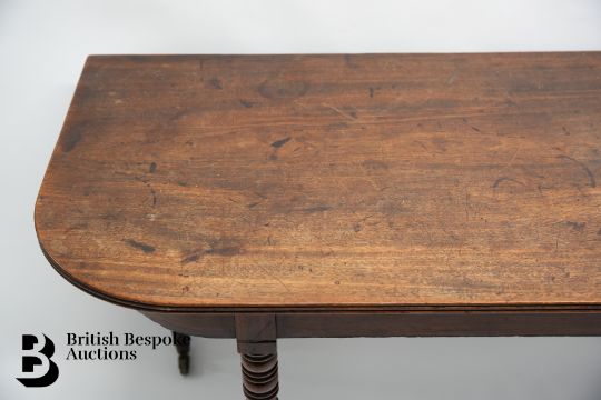 A late Regency mahogany dining table, late Regency, in two parts, with D-shaped top, on gadrooned turned supports and castors, approx 130 x 60 x 72 cms.  Provenance: formerly Glympton Park Oxfordshire. Condition Report Considerable marks to the tops of both tables, this will need attention.