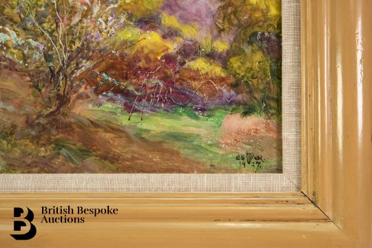 Edward Steel Harper, oil on board, entitled Mountain Gorse - Moelwyn at Ddualt (near Ffestiniog), signed with his trademark harp signature and dated May 1926. Artist label to verso Opus nr 437 and title, exhibited at the Southgate Gallery Summer Exhibition June-July 1987, approx 23.3 x 32 cms, including mount and frame 39.5 h x 48w cms.  Harper studied at the Birmingham School of Art, known to have painted over 2000 pictures in an exhibiting career that lasted 17 years.