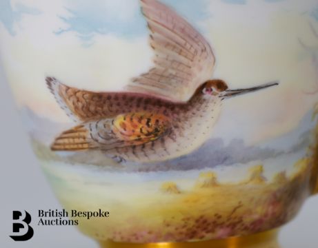 Four Minton Cheviot hand painted cups and saucers, artist A. Holland, hand painted with birds, H5107, including Partridge, Woodcock, Pochard and Red Grouse.