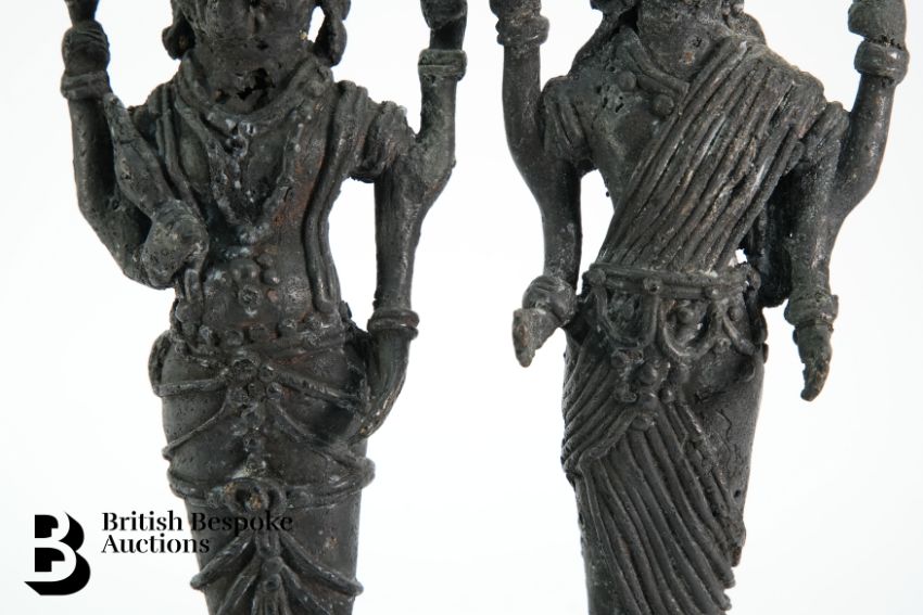 Two Indonesian cast mixed metal deity, the first casting is the god Ganesha, identified by his elephant head and four arms, dressed in traditional dress, stood on a lotus flower base, approx 32 cms h, the second casting is likely the god Vishnu, identified by his four arms, dressed in traditional dress, stood on a lotus flower base, approx 32 cms h. (2)