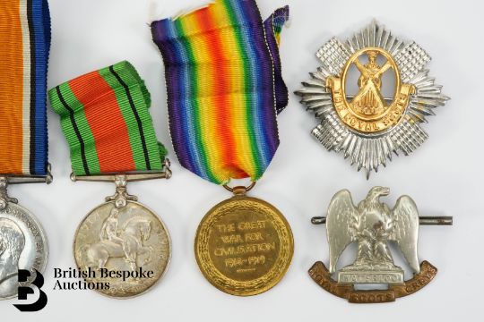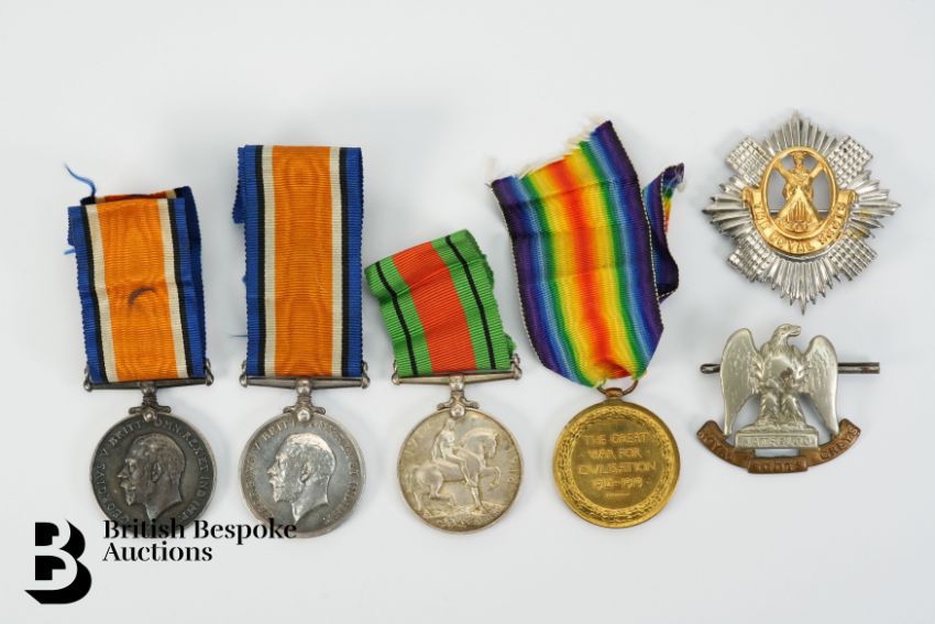 WWI medals named to 20957 Pte F.G Mills including The Victory medal and British War medal; a British War medal named to 471741 Spr  W.H Cutts Royal Engineers; British War medal to 5626 J.M Younger Royal Scots, together with a The Royal Scots badge and a Royal Scots Greys cap badge.