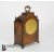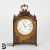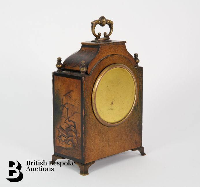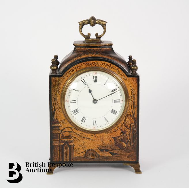 French black lacquer and gilt-japanned timepiece, early 20th century, with figures beside a riverside, white enamelled dial with Roman numerals, brass pediment, raised on four brass feet, approx 23 x 13 cms.