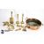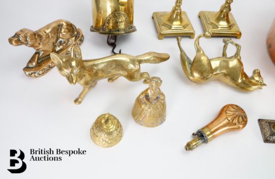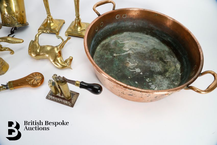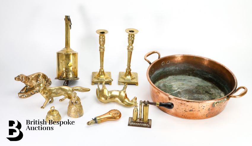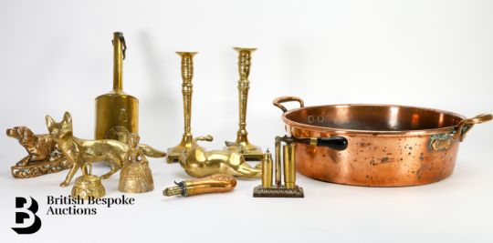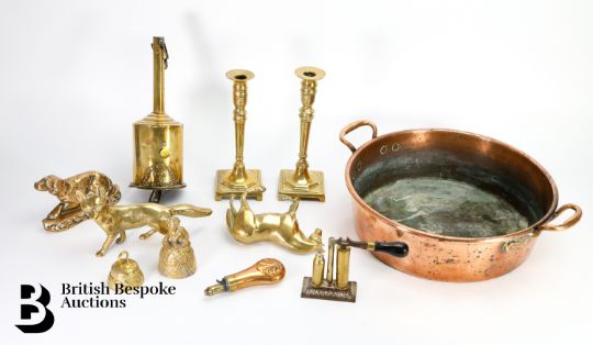 Quantity of brass including a John Linwood fire jack, pair of a brass candlesticks, approx 23 cms h, fox figure approx 22 cms in length, copper powder flask approx 13.5 cms, brass 12-bore shotgun cartridge reloading tool by James Dixon & Sons, copper jam pan approx 35 cms diameter.