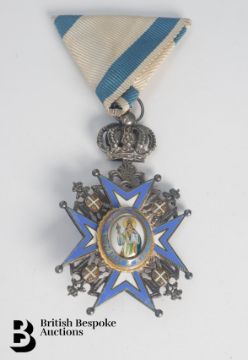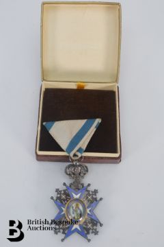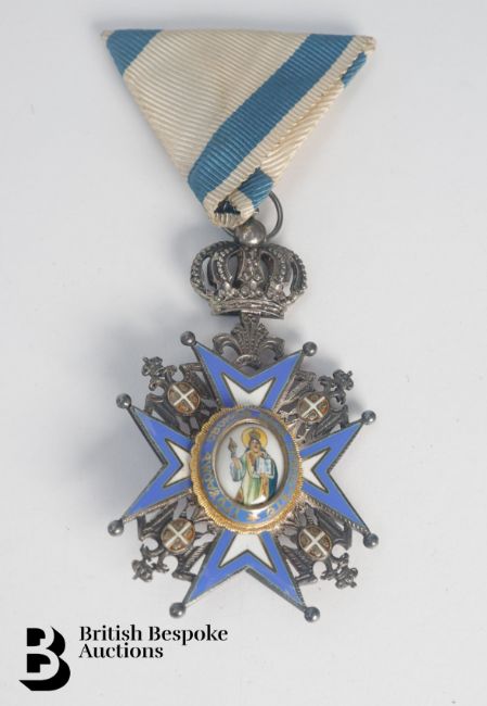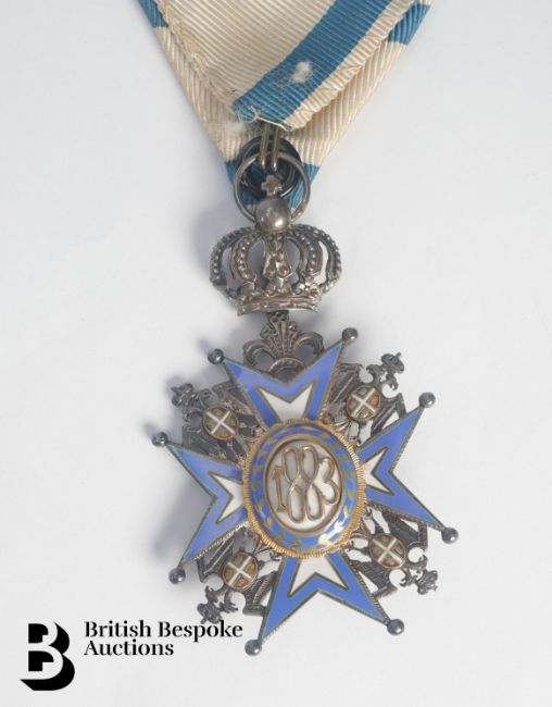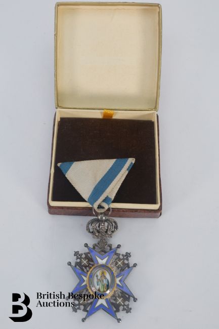Order of St Salva medallion, 5th type, silver and enamel, depicting the saint with green robes, the reverse dated 1883, with blue and white ribbon, established to recognize civilians for meritorious achievements, the order was discontinued in 1921.
