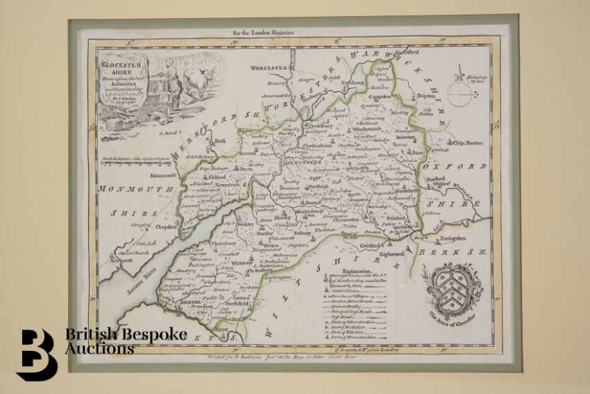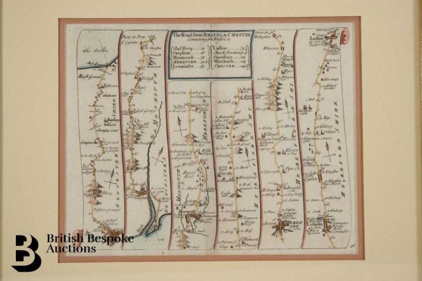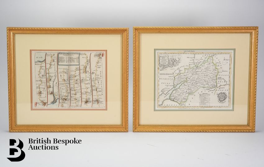T. Kitchin map of Gloucestershire, hand coloured, printed for R. Baldwin and another strip road map by John Senex, Bristol to Chester, hand coloured, approx 22 x 18 cms, both framed and glazed.