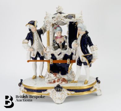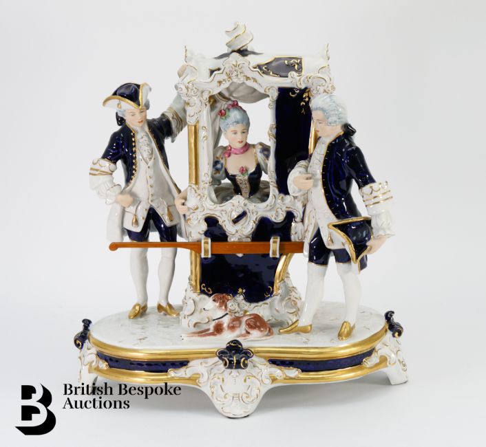 A large Royal Dux porcelain figural group featuring a lady in a chaise á porteurs with her attendants, approx 38 x 38 cms together with two Royal Dux figures on a gentleman and lady, all three with factory marks to base.