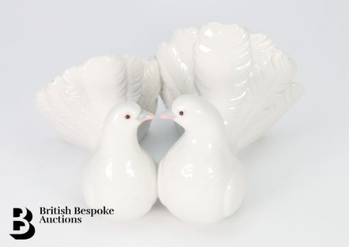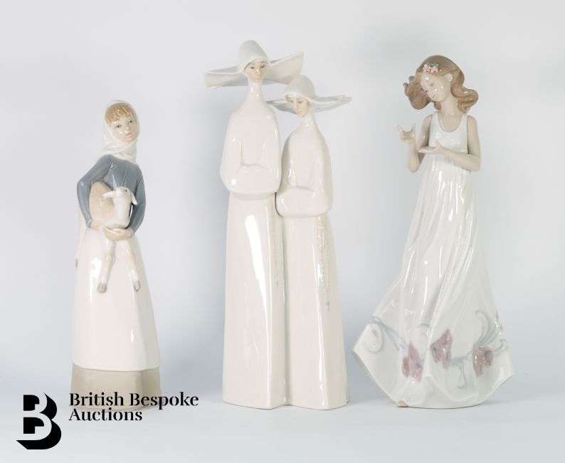 Lladro figurines, including a pair of doves nr 1169 approx 21 x 16 cms, a young girl nr 6777 approx 32 cms h, girl with lamb G-11 approx 28 cms h and a group of nuns nr G-30J approx 33 cms h, all with factory marks.