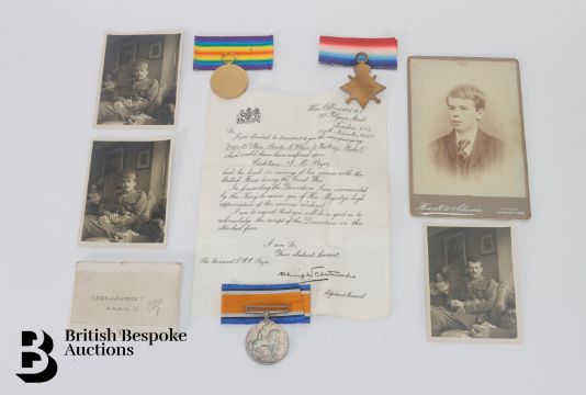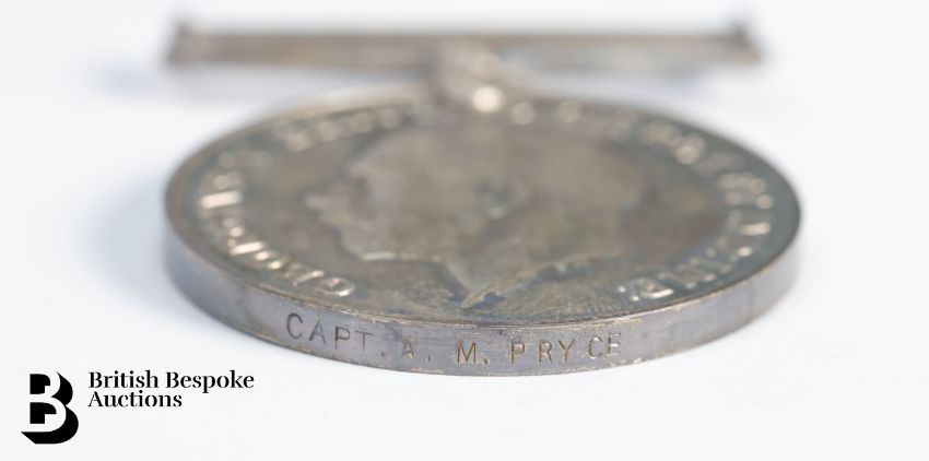 WWI service medals, Captain A.M Pryce (1877-1919), Arthur trained as a doctor and in particular as a bacteriologist. He joined the RAMC in 1914 and in December 1916 he became medical officer to the 14th Battalion Royal Welsh Fusiliers, with whom he served on the Somme. In 1918 he was appointed bacteriologist at the 35th General Hospital, Calais, where he succumbed to flu Feb 1919. This lot concludes with three photographs of Captain Pryce and a photograph of him as a boy.