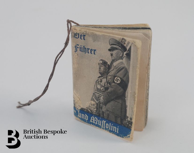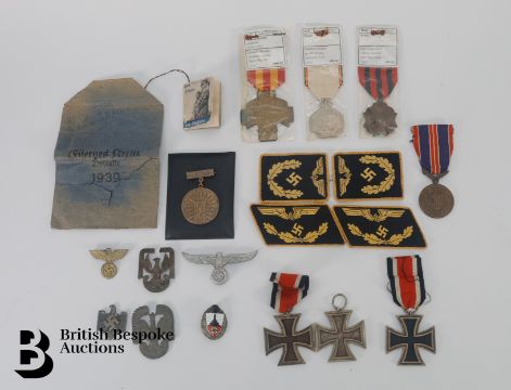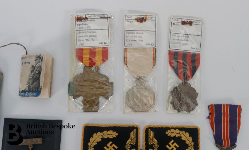 Three German Iron Cross, National Socialist League of the Reich Sports badge, 25 Year-German Veterans Association, Visor Cap Eagle, Polish Airforce badge x 2 (af), miniature propaganda booklet Der Fuhrer und Muffolini, Belgian Order of Leopold II bronze medal, Belgian Independence Centenary medal 1830-1930; Czechoslovakian Medal for Bravery, Czechoslovak Commemorative Medal of the National Revolutionary Army; four Third Reich collar badges.