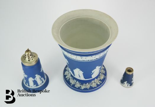The flared vase has a small chip to the outer rim (see image). Finial on the top of the sugar caster is slightly bent.