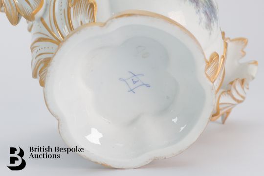18th Century Sevres cache pot, hand painted with a stream to one side and courting couple to the opposing side, with applied naturalistic handles, approx 12h x 17.5 diameter together with a French saucer in the Chinese style, hand painted with flowers, approx 12.5 cms diameter.