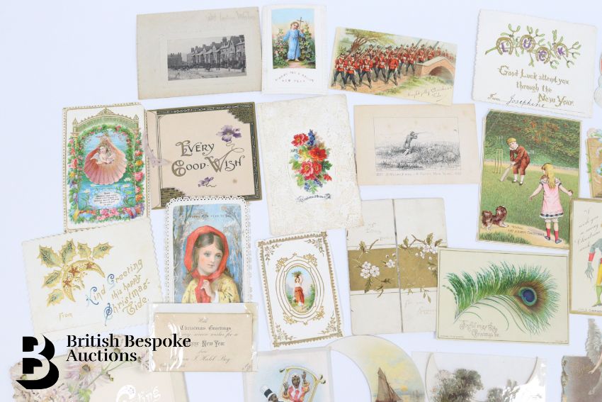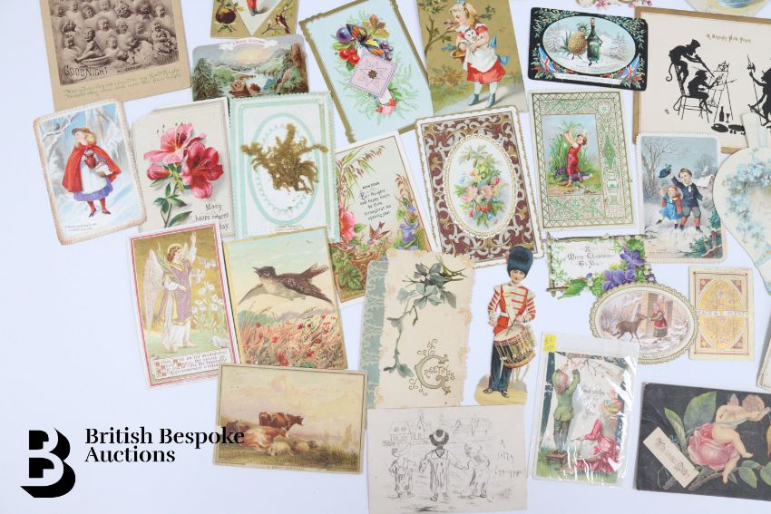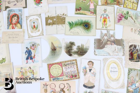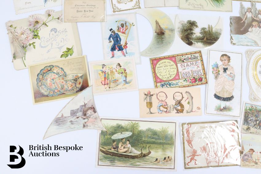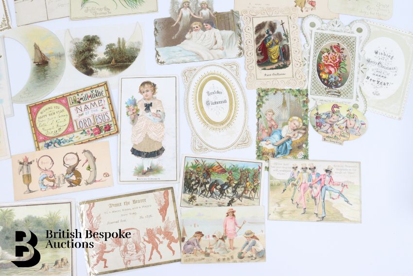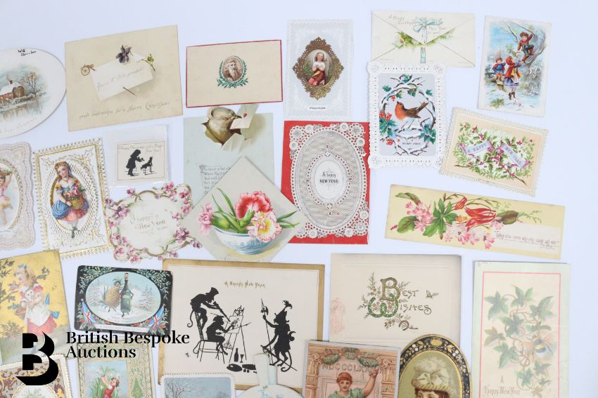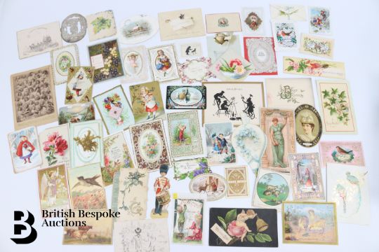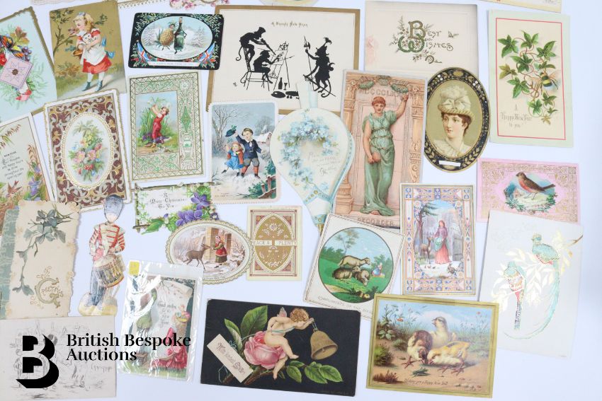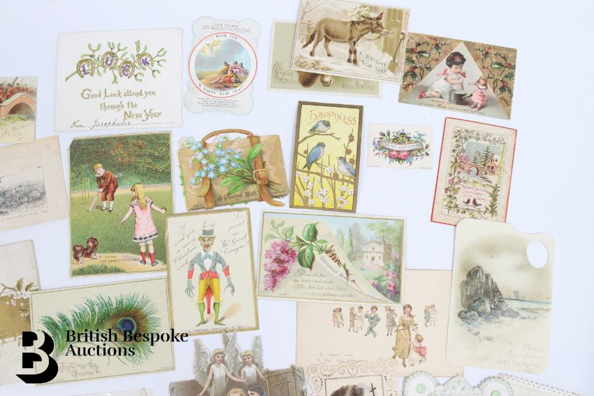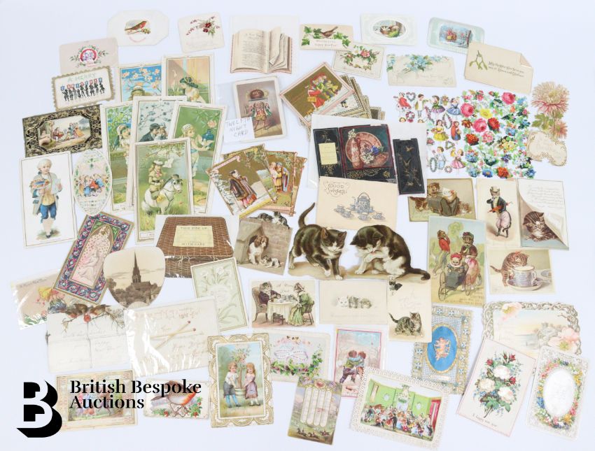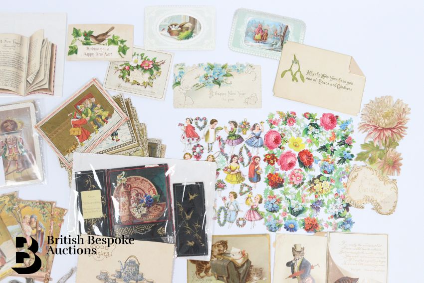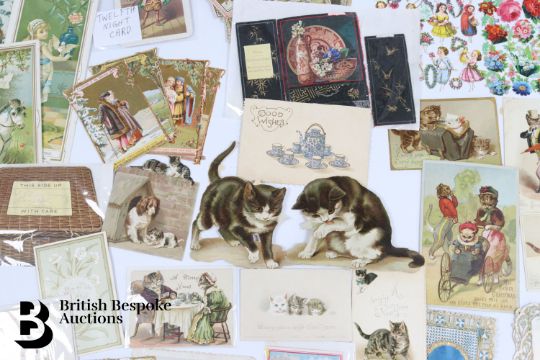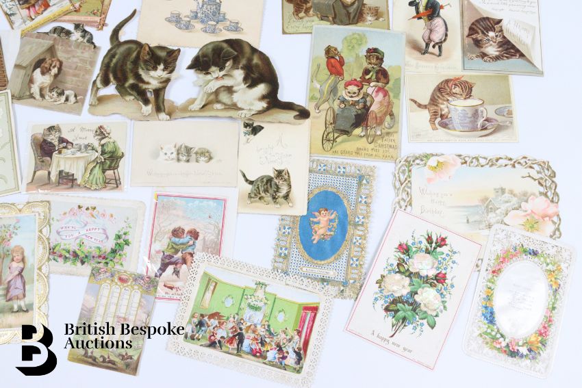 Collection of charming Victorian greetings cards, mostly Christmas and New Years, some German, Easter and Birthday, some featuring cats, including die cast, paper lace etc. Approx. 460 cards, good condition, some glue residue to backs.