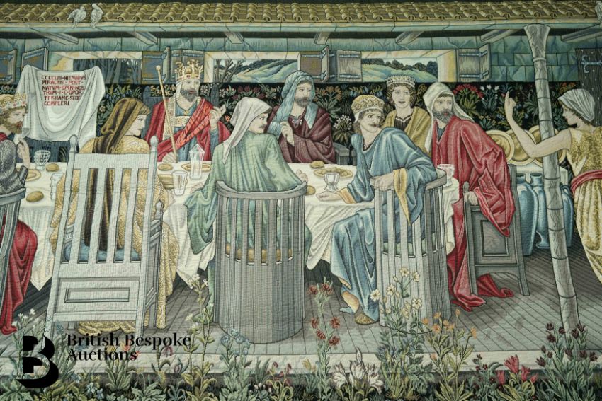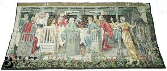 A 20th century tapestry, after William Morris 'The Summons' depicting King Arthur and his knights at table, summoned by a mysterious woman, approx 260 x 132 cms.