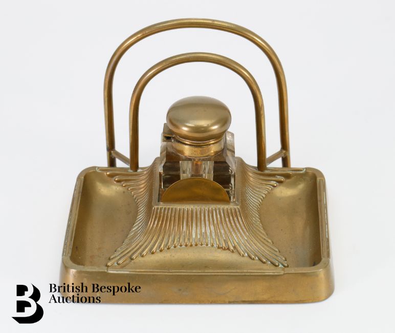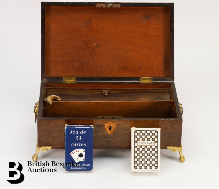 A rosewood writing box, with decorative inlay and fitted interior approx 41 x 23 x 12 cms together with another rosewood writing box with brass ball and claw feet with lion mask handle, approx 13 x 18 x 12 cms together with a brass ink stand with cut-glass ink jar approx 17 x 12 x 13 cms. (3)
