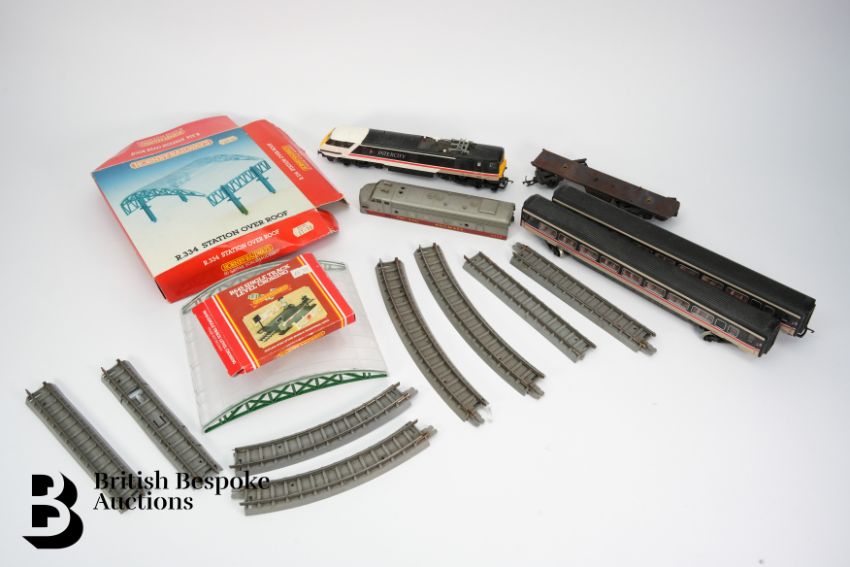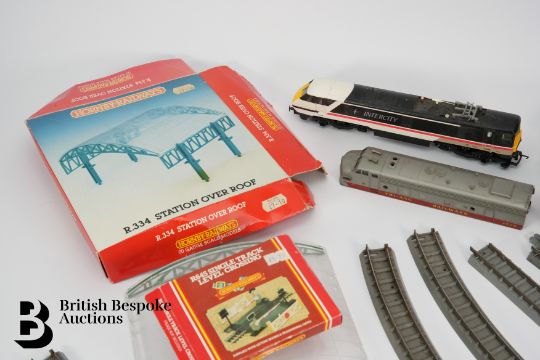 Box of Hornby and Triang Railwayana, including a quantity of tracks, Single Track Level Crossing, Station Over Roof, Intercity Train.