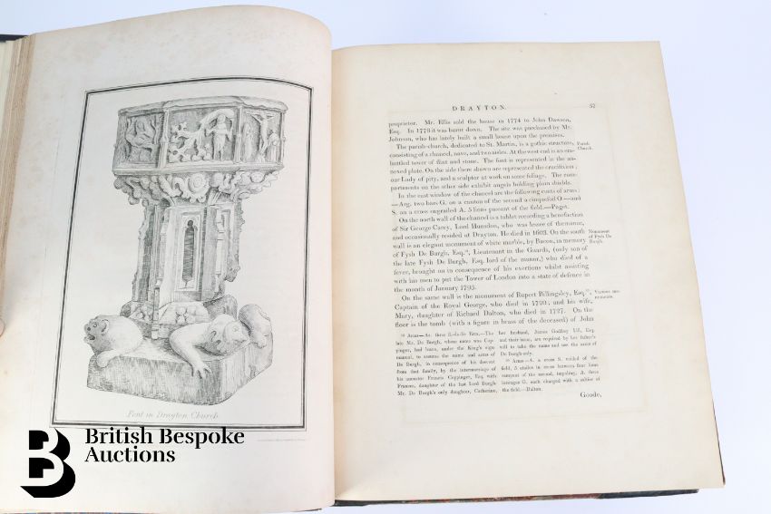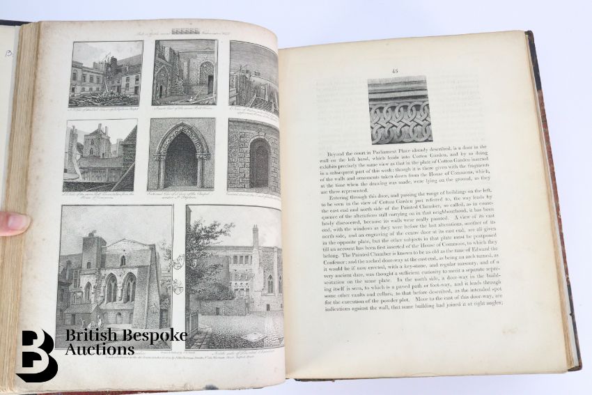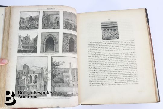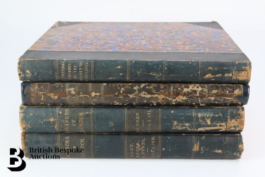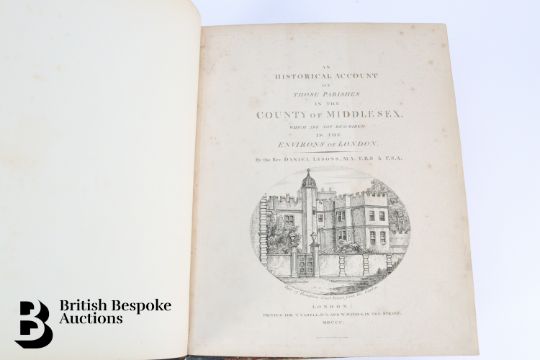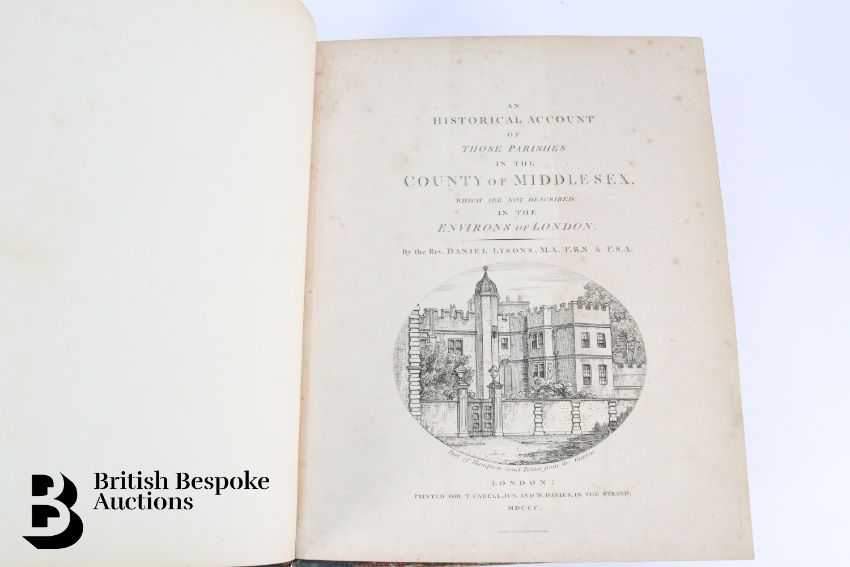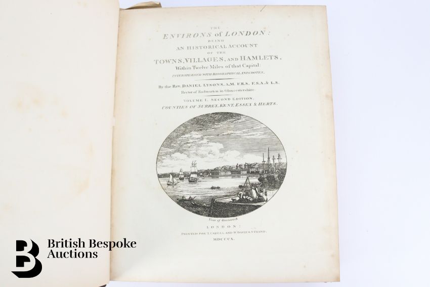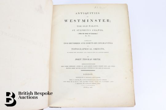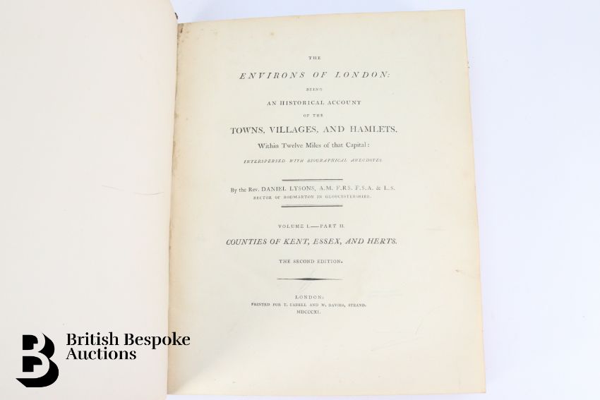 Vol I Part I County of Surrey Seconded 1811; Vol I Part II Counties of Kent, Essex and Herts The Second Edition London for Cadell 1811 The Country of Kent; An Historical Account of those parishes in the County of Middlesex which are not described in the Environs of London by Rev. Daniel Lysons 1800 London for Cadell; Antiquities of Westminster The Old Palace St Stephen's Chapel (now the House of Commons) containting 246 engravings of topographical objects of which 122 no longer remain, by John Thomas Smith, London June 9th 1807 including some hand coloured plates.