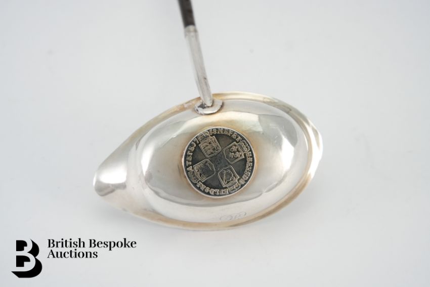 A whale bone and silver toddy ladle, the bowl of the ladle set with a George III silver coin, approx 33 cms.